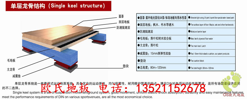 1、單層龍骨結(jié)構(gòu):此結(jié)構(gòu)的體育木地板,結(jié)構(gòu)簡單,安裝方便,成本相對較低。主要用于舞蹈室、舞臺、羽毛球室、乒乓球室。