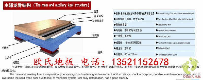 3、主副龍骨結(jié)構(gòu):此結(jié)構(gòu)的體育木地板,主龍骨和副龍骨相互銜接保證了體育地板整個結(jié)構(gòu)的穩(wěn)固性,再加上提升高度的標準,使其達到一個標準的運動效果,主要用于單位職工活動室,網(wǎng)球室,羽毛球室,或?qū)I(yè)要求不是很高的籃球館。例如:小學、中學籃球館等。