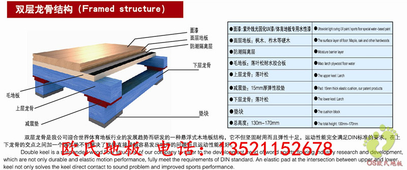 2、雙層龍骨結(jié)構(gòu):此結(jié)構(gòu)的體育木地板由于雙交叉鋪設,達到了理想的高度,所以整體結(jié)構(gòu)的穩(wěn)定性和沖擊吸收效果是*好的。主要應用于專業(yè)籃球比賽,比賽很激烈,對體育地板的性能要求很高。例如:籃球聯(lián)賽等。