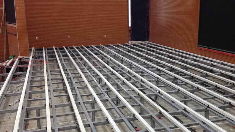 舞臺地板用材,面層為柞木,單層龍骨結(jié)構(gòu),鋪裝面積為103平方米。